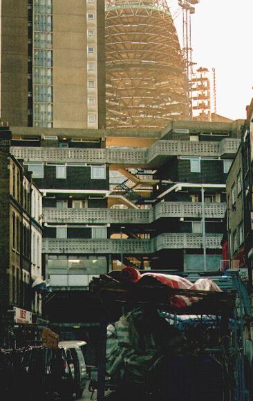 Gherkin looms behind residential buildings (view from an east London marketplace - could almost be a set from Eastenders - except you can't see the gherkin from Borehamwood)